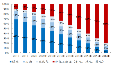 这一时期,新能源大幅度代替传统化石能源,在能源消费结构中占比提高到50%—80%,成为主体能源。与此同时,受碳排放约束,煤炭只剩下电力调峰、碳质还原剂以及保障能源供应安全等不能被替代的用途,煤炭消费量下降到12亿-15亿吨/年,由保障能源转变为支撑能源。