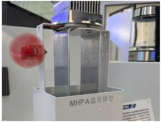 徐红霞:“这就是我们俗称的热电偶效应,也就是温差发电的原理。下边用超级导热材料迅速的提温,上边做成这种冷通道,它就会产生电流,推动风车的转动。”
