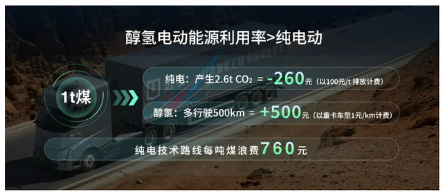 目前国家电网70%的电力都是煤电,1吨煤发3300度电,产生2.6吨二氧化碳,49T纯电重卡行驶约1900km;1吨非优质煤可制0.66吨甲醇,产生1.67吨二氧化碳,将其加氢可制1.21吨甲醇,合计产甲醇1.87吨,49T甲醇重卡可行驶约2400km。同样1吨煤,甲醇重卡比纯电重卡可多行驶500公里。而这2.6吨二氧化碳,按照100元/吨排放收费,共计260元,500公里按照1元/公里计算,共计500元,可以得出结论,每吨煤发电浪费760元人民币,也就是说从能源利用效率及节能减排角度讲,醇氢电动重卡比电动重卡更节能减排。