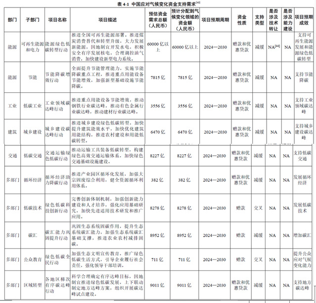 综合考虑减缓和适应行动,中国从报告年份(2024 年)到2030 年的总资金需求规模约为25.2 万亿元,年均约3.6 万亿元;从2031—2060 年的总资金需求规模约为243 万亿元,年均约8.1 万亿元。