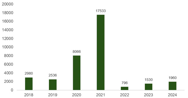 2024年尚无新签发的CCER交易,年内交易仍集中于存量CCER。根据对各交易机构官网及微信公众号披露的数据整理显示,2024年全国CCER交易量达1959.87万吨,较2023年同比上涨29%。值得注意的是,因湖北、重庆、福建等地未公开披露2024年CCER交易数据,且北京披露数据主要覆盖线上交易,此成交量数据可能存在低估。同时,经过全国碳市场逾三年的运行与履约清缴,大量存量CCER也被用于清缴抵消,对旧CCER有较大消耗。