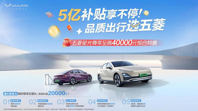 为了让更多年轻用户、家庭用户享受到高品质的绿色出行体验,五菱在3月特别推出“5亿补贴享不停!品质出行选五菱”的政策,用户购买星光尊享至高40000元综合特惠,包括至高10000元现金优惠、不限品牌至高7000元置换补贴、三电终身质保,及指定车型送充电桩和免费车机流量等福利。
