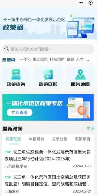 “—体化示范区政策专区”则分为“惠企惠民政策”和“政策汇编”两大部分,用户输入关键词即可查询示范区的专属惠企惠民政策及其他一体化发展政策,致力于为示范区内的企业和个人提供更优质高效的“全景式”便企便民服务。