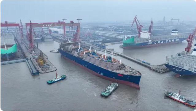 3月24日,沪东中华自主研发的第五代液化天然气(LNG)船型出坞。与上一代相比,此船型单日航行碳排放可减少10吨以上,货舱转载率更高。目前,沪东中华造船(集团)有限公司手持该船型订单30多艘,累计LNG船订单逾50艘,交付期已安排至2028年,跻身全球大型LNG运输船建造的第一方阵。