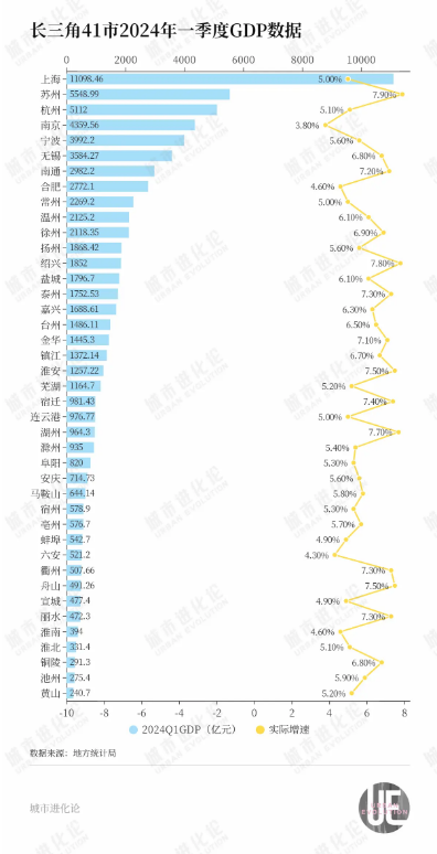 增速方面,苏州GDP增速达到了7.9%,成为了长三角增速冠军,绍兴和湖州分别以7.8%、7.7%的增速居于长三角第二、三位。与之相应的是南京,在今年一季度增速仅为3.8%,位居长三角末位,六安4.3%的增速居于倒数第二,淮南、合肥则以4.6%的增速并列倒数第三。