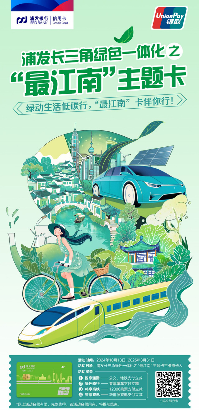 浦发银行信用卡面向长三角商务族客群的精细化经营与普惠金融实践,不仅体现在产品设计的精准定位上,更在于其深入洞察并满足这一客群对绿色、便捷、高效金融服务的需求。通过推出“最江南”主题卡,并围绕其高频使用的绿色出行场景打造专属优惠,浦发信用卡不仅降低了绿色消费门槛,提升了用户体验,还进一步拓宽了普惠金融的覆盖面。这一举措不仅加深了与长三角商务族客群的连接,也彰显了浦发银行信用卡在推动区域绿色经济发展、实现金融普惠方面的责任与担当。