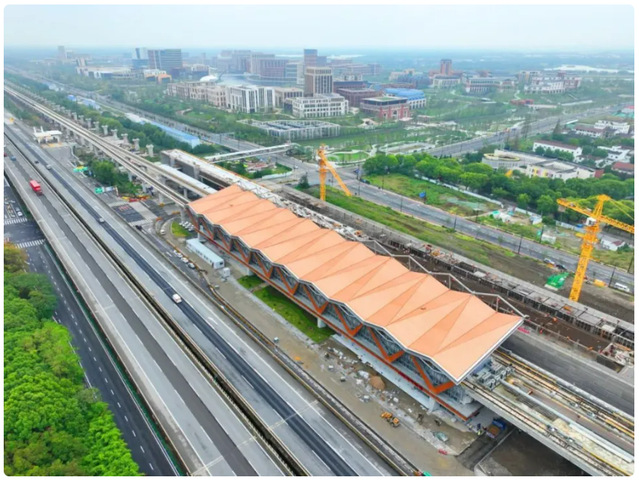沿着G50沪渝高速行至青浦金泽,路边一个黄色如“折扇”的建筑非常醒目,这就是上海轨道交通17号线西延伸线的西岑站。从17号线东方绿舟站到西岑站,约6公里距离,行驶时间6分钟。经过3年多的建设,线路已进入空载试运营阶段,计划于今年年底通车。