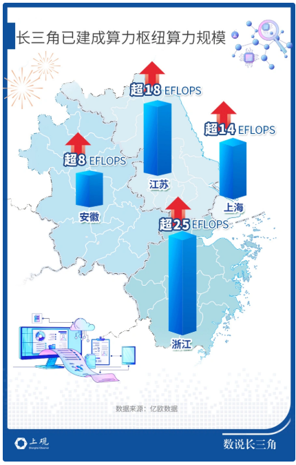 相关数据显示,截至2023年底,全国在用数据中心标准机架超过810万架,算力总规模达到230EFLOPS,算力总规模近5年年均增速近30%。作为八大国家算力枢纽节点之一的长三角地区,尤其注重发展算力规模。三省一市中,浙江省目前的算力规模最高,达25.67EFLOPS。