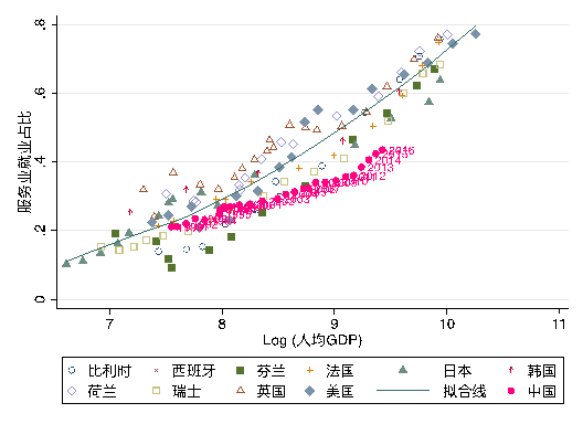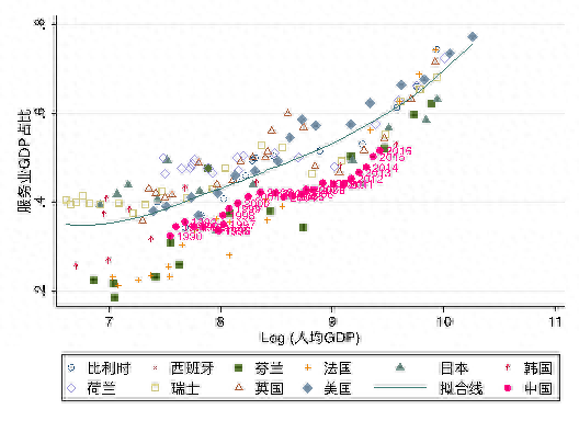 图1服务业部门就业占比和GDP占比 本文图片均为作者自绘数据来源:https://www.rug.nl/ggdc/historicaldevelopment/maddison/releases/maddison-database-2010 Maddison Project Database, 2010版。
