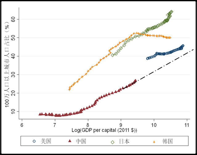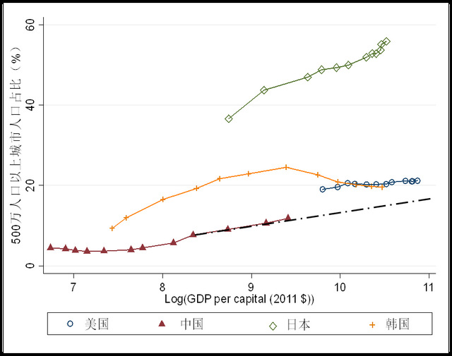 图6人均GDP和大城市人口集聚数据来源:100万人口以上城市人口占比变化趋势图数据来源于世界银行,https://datacatalog.worldbank.org/public-licenses#cc-by。人均GDP是购买力平价的GDP比上总人口,统一换算成2011年的国际美元价格数据来源于Maddison Project Database, 2018版,https://www.rug.nl/ggdc/historicaldevelopment/maddison/releases/maddison-database-2018。500万人口以上城市人口占比变化趋势图数据来源于《World Urbanization Prospects 2018》:https://population.un.org/wup/Download/。