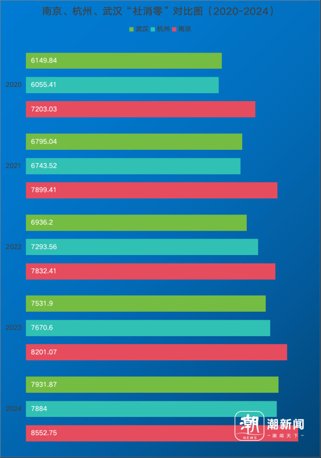目前,国内社消零超过7000亿元的还有三座城市,分别是南京8552.75亿元、武汉7931.87亿元、杭州7884亿元;三座城市也均给出了冲刺“万亿”“准万亿”的具体时间线。