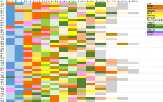 一般来说,发展目标在文中位置越靠前,表明其受重视程度越高。基于此假设,澎湃研究所对长三角41城“十四五”规划文本的目录顺序进行编码,得到这期间他们对不同经济社会事务的规划优先级全景图(图1),共有13个规划主题。