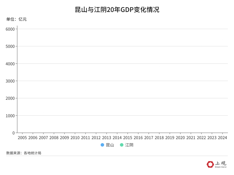 多年来,江阴与昆山可谓棋逢对手。很长一段时间内,江阴GDP大幅领先昆山。直到2009年,昆山超越江阴,当年昆山与江阴GDP分别为1750.1亿元、1713.2亿元。随后,昆山虽一直保持领先,但并无绝对优势,江阴一度成为已经踩到脚跟的追赶者,2018年江阴曾将与昆山的差距追至仅相差25.9亿元,随后又逐渐拉开。如今,迈上5000亿元新台阶的昆山与江阴,还将延续不断突破天花板的态势。