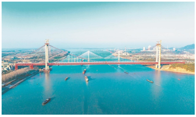 在建的G3铜陵长江公铁大桥横跨两岸格外壮观,长江上货船穿梭不息,一派繁忙运输景象。大桥建成通车后,对于加快区域协调发展、加强长三角互联互通具有重要意义。