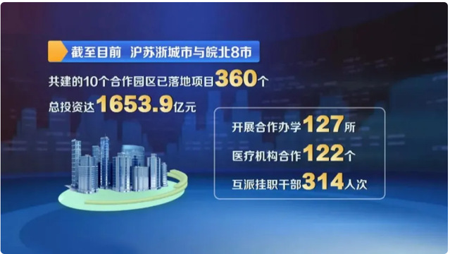 从“拉一把”的结对帮扶迈向“同获益”的互利共赢,截至目前,沪苏浙城市与皖北8市共建的10个合作园区已落地项目360个、总投资达1653.9亿元;开展合作办学127所,医疗机构合作122个,互派挂职干部314人次,形成了互利共赢的链式反应。