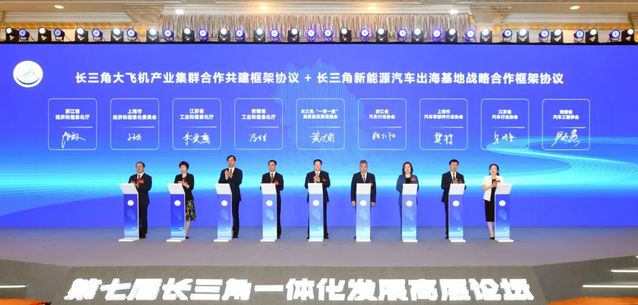 长三角大飞机产业集群合作共建框架协议+长三角新能源汽车出海基地战略合作框架协议签约仪式。上海市经信委 供图