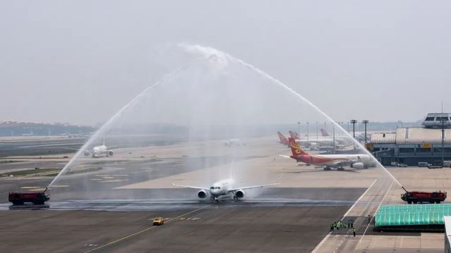 C919接受“水门礼”。东航 供图