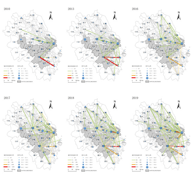 图 2 2010-2019年长三角G60科创走廊沿线城市创新网络空间演化,作者基于自然资源部地图技术审查中心标准地图服务网站的标准地图(审图号:GS(2019)1822号)绘制,底图无修改。