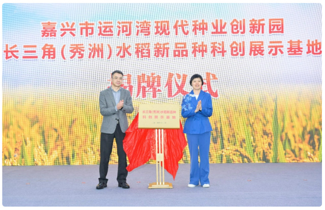 随着红布缓缓落下,长三角(秀洲)水稻新品种科创展示基地正式揭牌。