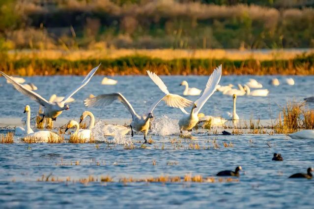2024年11月30日,成群天鹅在十八联圩生态湿地栖息、嬉戏。阮雪枫 摄