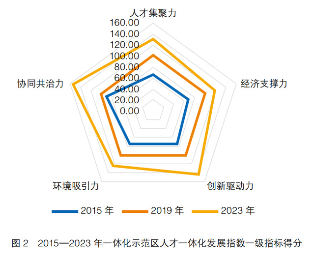 从2015年至2023年间的指数得分变化来看,一体化示范区的发展指数一级指标——人才集聚力、经济支撑力、创新驱动力、生态吸引力和协同共治力得分均实现了显著提升(如图2)。一体化示范区协同共治水平的持续提升加快了区域人才一体化发展的步伐,这种协同共治的模式不仅优化了人才配置,提升了人才利用效率,还对区域的经济支撑力、创新驱动力以及环境吸引力产生了显著的拉动和促进作用。