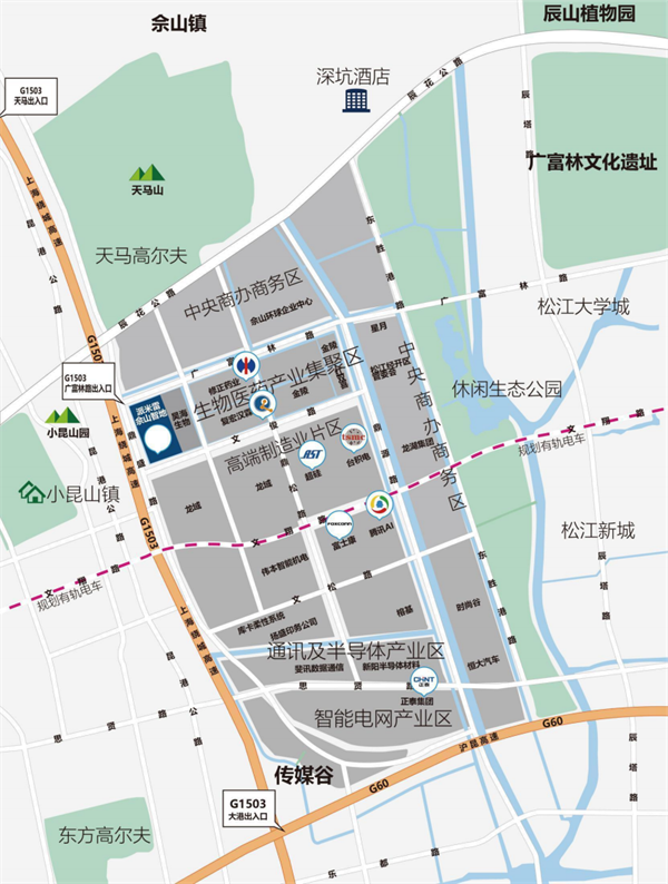 项目地处长三角一体化发展核心区,紧邻G60科创走廊枢纽,1小时辐射长三角主要城市。依托松江枢纽“四网融合”交通体系(高铁、轨交、高速、航空),半小时直达虹桥商务区,区位优势得天独厚。