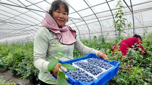 产业兴旺,为当地带来了就业增收的新机遇。基地日常雇佣采工约600人。“我们采摘工钱是多劳多得,采摘时要求果实必须全黑,带红色的不能要。”采工陈秀人一边手脚麻利地采摘着蓝莓,一边笑着分享,“手脚快的话,一天能挣300多元。在家门口就能挣到钱,日子越过越有盼头。”