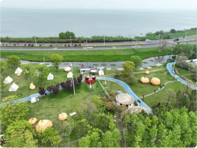 2024年4月11日,在浙江省湖州市吴兴区杨溇村,游客在太湖边的杨桂珍螃蟹庄园参观游览(无人机照片)。为改善太湖水质,2019年太湖完成“退蟹还湖”,在太湖水域围网养殖的大闸蟹全部搬迁至内塘养殖。
