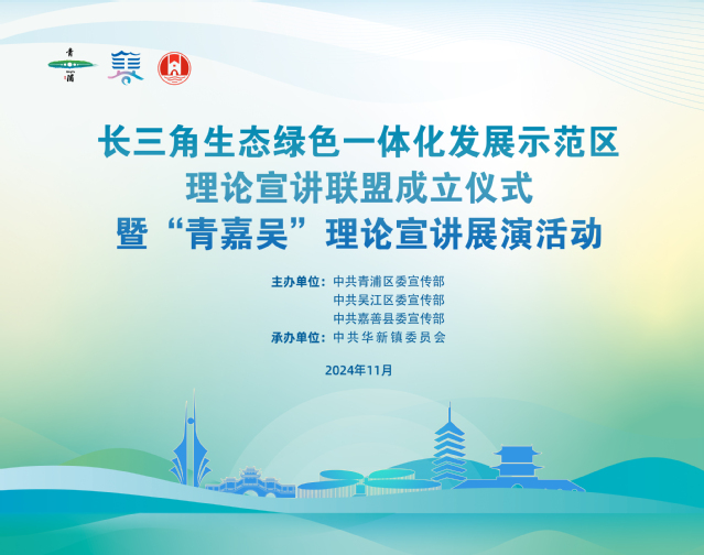 为深入学习宣传贯彻习近平新时代中国特色社会主义思想和党的二十届三中全会精神,全面贯彻落实习近平总书记关于长三角一体化发展的重要讲话和重要指示批示精神,发挥示范区区域协作和资源整合优势,构建青吴嘉三地立体化理论传播大矩阵,11月19日,由中共青浦区委宣传部、中共吴江区委宣传部、中共嘉善县委宣传部共同主办,中共华新镇委员会承办的“长三角生态绿色一体化发展示范区理论宣讲联盟成立仪式暨‘青吴嘉’理论宣讲展演活动”在青浦举行。