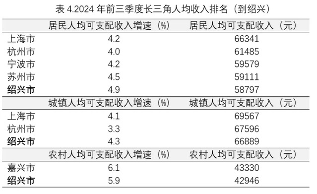 绍兴经济“藏富于民”,人均收入高。2024年前三季度,绍兴居民人均可支配收入为58797元,在长三角41城中排名第五,仅次于沪杭宁苏。其中城镇居民人均可支配收入为66889元,在长三角排名第三,仅次于沪杭;农村人均可支配收入为42946元,在长三角排第二,仅次于嘉兴(表4)。