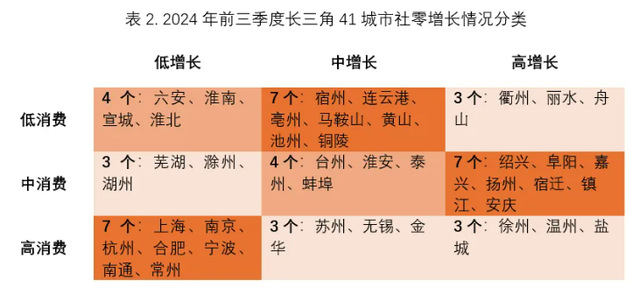 也就是说,当前长三角消费的整体格局是,较高消费水平的城市(尤其是万亿级大城市)增速放缓,而较低消费水平的城市则进入了消费扩张期。这一特征在前二季度就已初现端倪,而第三季度这一现象更加强化,更多的城市向表2深色区涌入。