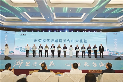 现场向劳模代表赠送天台山大礼包。
