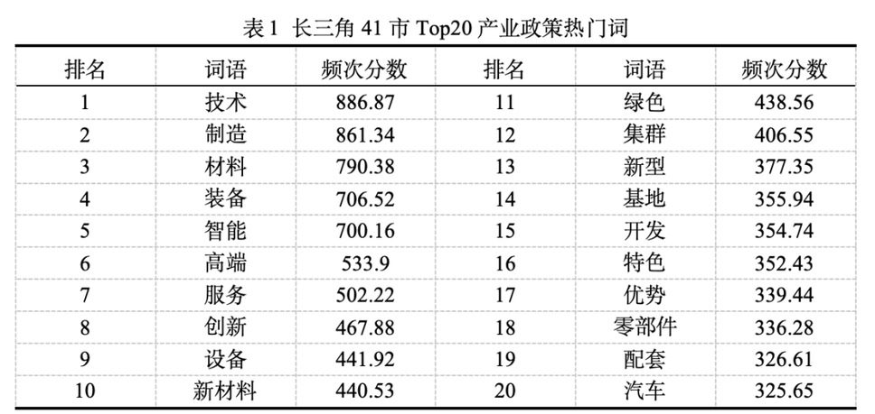 (1)制造业的绝对压舱石地位。统计数据显示,“制造”、“技术”、“材料”、“装备”等词汇的权重得分在所有产业词汇中占据断层式优势。这一结果有力印证了长三角作为“世界级先进制造业集群”的战略定位。无论是在产业发展的引领城市,还是在产业转移的承接城市,制造产业均被视为城市发展的重要基石。