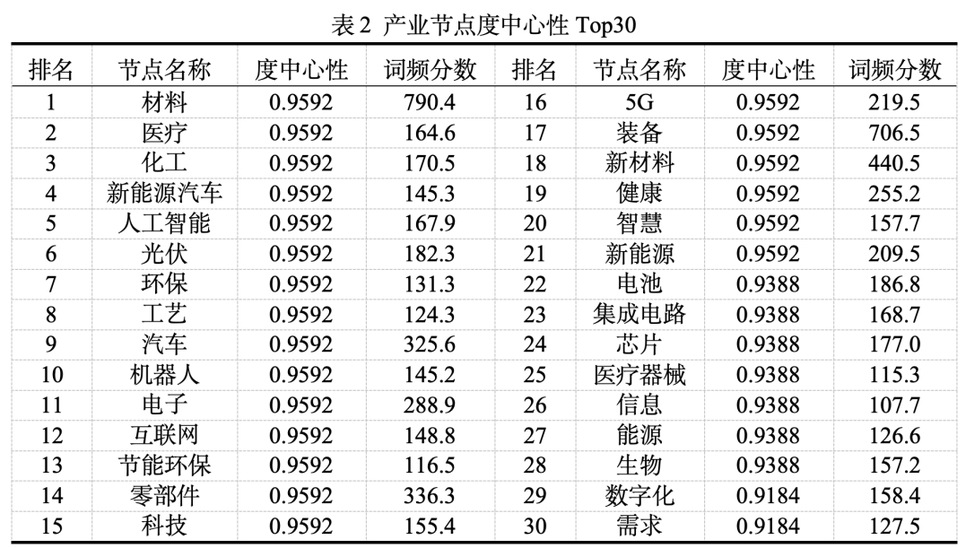 进一步对产业共词网络中的产业节点进行度中心性分析,以便观测到成为关键节点的重点产业。于是,本文对Top30产业节点的度中心性进行计算(如表2)。